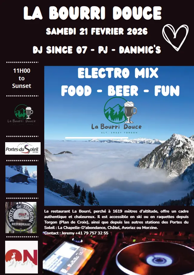 Cette manifestation est l'occasion parfaite de rencontrer, de partager et de faire la fête dans une atmosphère conviviale et festive. Venez vivre un moment unique à Torgon lors de "La Bourri Douce".
