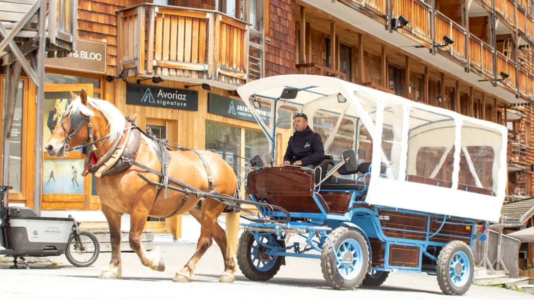 La calèche à assistance électrique tirée par des chevaux vous permettra de vous déplacer à Avoriaz tout en passant un bon moment en famille.